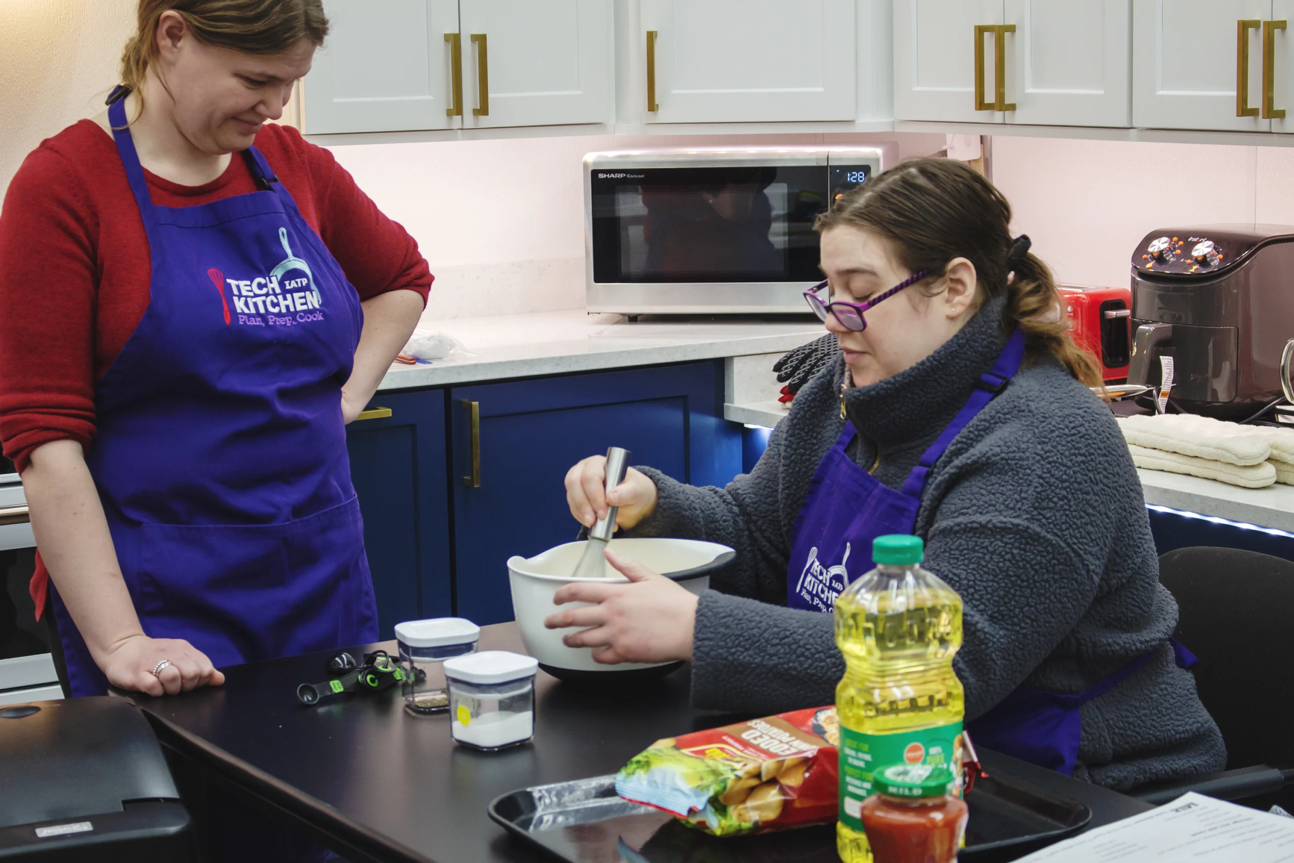 Mixing ingredients together is a key part of preparing food.  Adapted mixing tools help the cook to combine ingredients quickly, with less effort and mess.